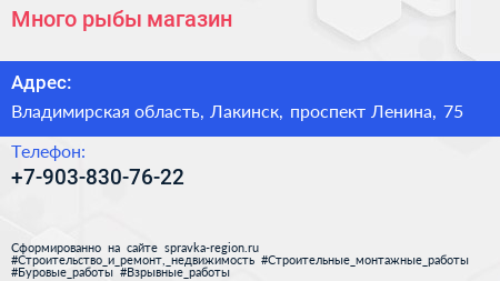 Много рыбы, магазин по адресу Владимирская область, Лакинск, проспект Ленина, 75 в дальнейшем Организация, размещена в следующих категориях: