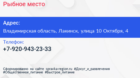 Рыбное место по адресу Владимирская область, Лакинск, улица 10 Октября, 4 в дальнейшем Организация, размещена в следующих категориях: