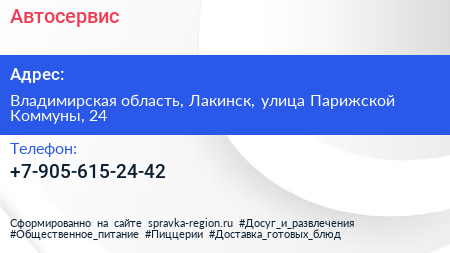 Автосервис по адресу Владимирская область, Лакинск, улица Парижской Коммуны, 24 в дальнейшем Организация, размещена в следующих категориях: