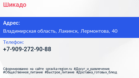 Шикадо по адресу Владимирская область, Лакинск, Лермонтова, 40 в дальнейшем Организация, размещена в следующих категориях: