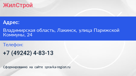 ЖилСтрой по адресу Владимирская область, Лакинск, улица Парижской Коммуны, 24 в дальнейшем Организация, размещена в следующих категориях: