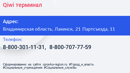 Qiwi, терминал по адресу Владимирская область, Лакинск, 21 Партсъезда, 11 в дальнейшем Организация, размещена в следующих категориях: