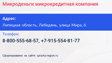 Микроденьги, микрокредитная компания по адресу Липецкая область, Лебедянь, улица Мира, 6 в дальнейшем Организация, размещена в следующих категориях: