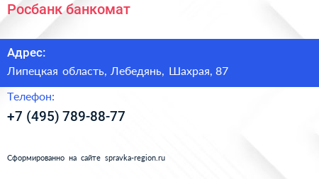 Росбанк, банкомат по адресу Липецкая область, Лебедянь, Шахрая, 87 в дальнейшем Организация, размещена в следующих категориях: