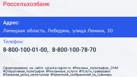 Россельхозбанк по адресу Липецкая область, Лебедянь, улица Ленина, 10 в дальнейшем Организация, размещена в следующих категориях: