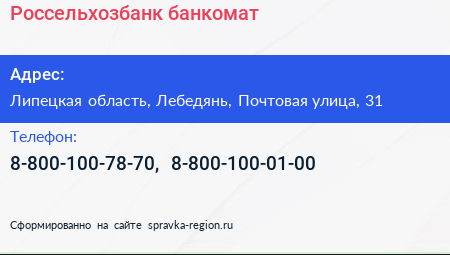 Россельхозбанк, банкомат по адресу Липецкая область, Лебедянь, Почтовая улица, 31 в дальнейшем Организация, размещена в следующих категориях: