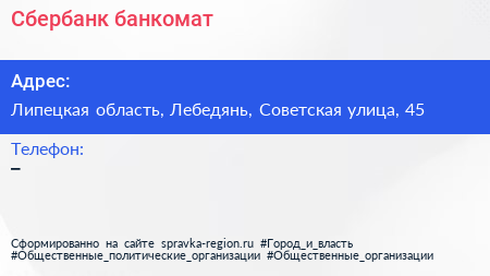 Сбербанк, банкомат по адресу Липецкая область, Лебедянь, Советская улица, 45 в дальнейшем Организация, размещена в следующих категориях: