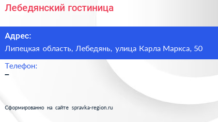 Лебедянский, гостиница по адресу Липецкая область, Лебедянь, улица Карла Маркса, 50 в дальнейшем Организация, размещена в следующих категориях: