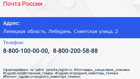 Почта России по адресу Липецкая область, Лебедянь, Советская улица, 2 в дальнейшем Организация, размещена в следующих категориях: