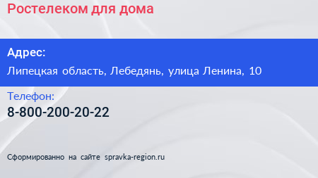 Ростелеком для дома по адресу Липецкая область, Лебедянь, улица Ленина, 10 в дальнейшем Организация, размещена в следующих категориях: