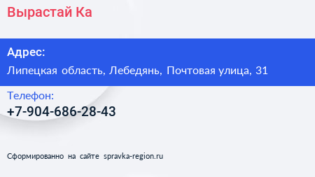 Вырастай-Ка по адресу Липецкая область, Лебедянь, Почтовая улица, 31 в дальнейшем Организация, размещена в следующих категориях: