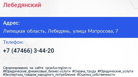 Лебедянский по адресу Липецкая область, Лебедянь, улица Матросова, 7 в дальнейшем Организация, размещена в следующих категориях: