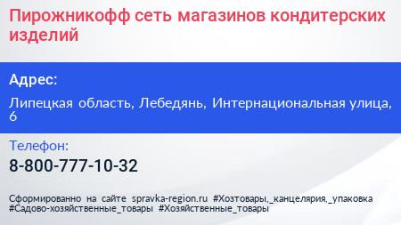 Пирожникофф, сеть магазинов кондитерских изделий по адресу Липецкая область, Лебедянь, Интернациональная улица, 6 в дальнейшем Организация, размещена в следующих категориях: