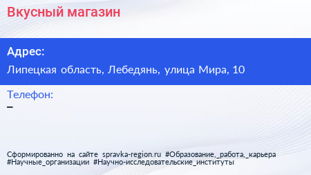 Вкусный, магазин по адресу Липецкая область, Лебедянь, улица Мира, 10 в дальнейшем Организация, размещена в следующих категориях: