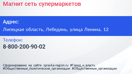 Магнит, сеть супермаркетов по адресу Липецкая область, Лебедянь, улица Ленина, 12 в дальнейшем Организация, размещена в следующих категориях: