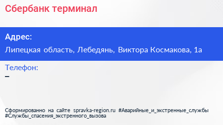 Сбербанк, терминал по адресу Липецкая область, Лебедянь, Виктора Космакова, 1а в дальнейшем Организация, размещена в следующих категориях: