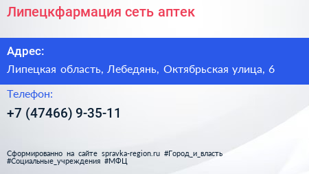 Липецкфармация, сеть аптек по адресу Липецкая область, Лебедянь, Октябрьская улица, 6 в дальнейшем Организация, размещена в следующих категориях: