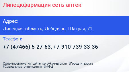 Липецкфармация, сеть аптек по адресу Липецкая область, Лебедянь, Шахрая, 71 в дальнейшем Организация, размещена в следующих категориях: