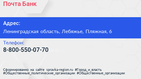 Почта Банк по адресу Ленинградская область, Лебяжье, Пляжная, 6 в дальнейшем Организация, размещена в следующих категориях: