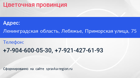 Цветочная провинция по адресу Ленинградская область, Лебяжье, Приморская улица, 75 в дальнейшем Организация, размещена в следующих категориях: