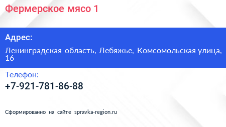 Фермерское мясо №1 по адресу Ленинградская область, Лебяжье, Комсомольская улица, 16 в дальнейшем Организация, размещена в следующих категориях: