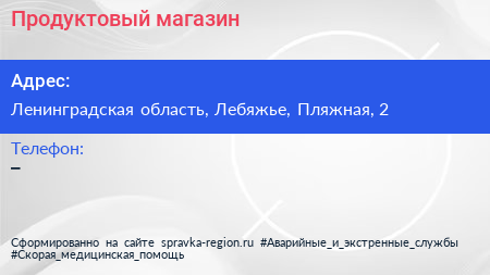 Продуктовый магазин по адресу Ленинградская область, Лебяжье, Пляжная, 2 в дальнейшем Организация, размещена в следующих категориях: