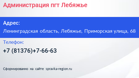 Администрация, пгт. Лебяжье по адресу Ленинградская область, Лебяжье, Приморская улица, 68 в дальнейшем Организация, размещена в следующих категориях: