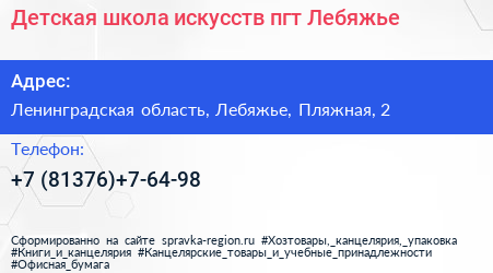 Детская школа искусств, пгт. Лебяжье по адресу Ленинградская область, Лебяжье, Пляжная, 2 в дальнейшем Организация, размещена в следующих категориях:
