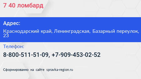 7:40, ломбард по адресу Краснодарский край, Ленинградская, Базарный переулок, 23 в дальнейшем Организация, размещена в следующих категориях:
