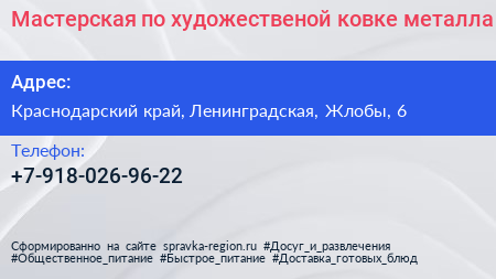 Мастерская по художественой ковке металла по адресу Краснодарский край, Ленинградская, Жлобы, 6 в дальнейшем Организация, размещена в следующих категориях: