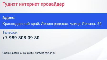 Гуднэт, интернет-провайдер по адресу Краснодарский край, Ленинградская, улица Ленина, 52 в дальнейшем Организация, размещена в следующих категориях: