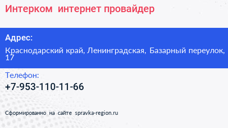 Интерком+, интернет-провайдер по адресу Краснодарский край, Ленинградская, Базарный переулок, 17 в дальнейшем Организация, размещена в следующих категориях: