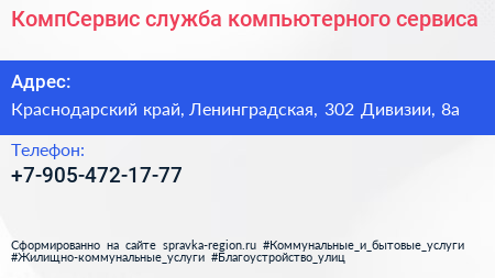 КомпСервис, служба компьютерного сервиса по адресу Краснодарский край, Ленинградская, 302 Дивизии, 8а в дальнейшем Организация, размещена в следующих категориях: