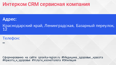 Интерком-CRM, сервисная компания по адресу Краснодарский край, Ленинградская, Базарный переулок, 12 в дальнейшем Организация, размещена в следующих категориях: