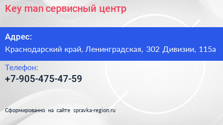 Key-man, сервисный центр по адресу Краснодарский край, Ленинградская, 302 Дивизии, 115а в дальнейшем Организация, размещена в следующих категориях: