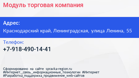 Модуль, торговая компания по адресу Краснодарский край, Ленинградская, улица Ленина, 55 в дальнейшем Организация, размещена в следующих категориях: