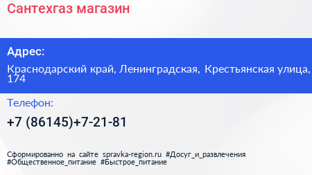 Сантехгаз, магазин по адресу Краснодарский край, Ленинградская, Крестьянская улица, 174 в дальнейшем Организация, размещена в следующих категориях:
