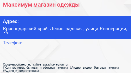 Максимум, магазин одежды по адресу Краснодарский край, Ленинградская, улица Кооперации, 75 в дальнейшем Организация, размещена в следующих категориях: