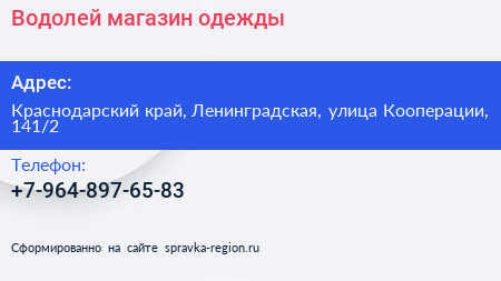 Водолей, магазин одежды по адресу Краснодарский край, Ленинградская, улица Кооперации, 141/2 в дальнейшем Организация, размещена в следующих категориях: