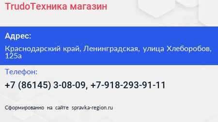 TrudoТехника, магазин по адресу Краснодарский край, Ленинградская, улица Хлеборобов, 125а в дальнейшем Организация, размещена в следующих категориях: