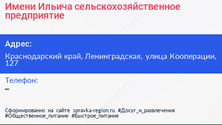 Имени Ильича, сельскохозяйственное предприятие по адресу Краснодарский край, Ленинградская, улица Кооперации, 127 в дальнейшем Организация, размещена в следующих категориях: