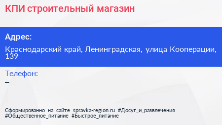 КПИ, строительный магазин по адресу Краснодарский край, Ленинградская, улица Кооперации, 139 в дальнейшем Организация, размещена в следующих категориях: