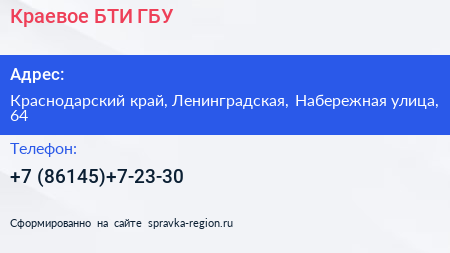 Краевое БТИ, ГБУ по адресу Краснодарский край, Ленинградская, Набережная улица, 64 в дальнейшем Организация, размещена в следующих категориях: