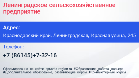 Ленинградское, сельскохозяйственное предприятие по адресу Краснодарский край, Ленинградская, Красная улица, 245 в дальнейшем Организация, размещена в следующих категориях: