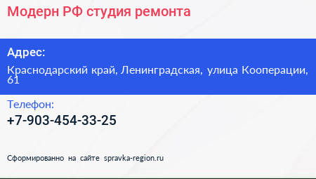 Модерн РФ, студия ремонта по адресу Краснодарский край, Ленинградская, улица Кооперации, 61 в дальнейшем Организация, размещена в следующих категориях: