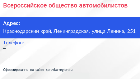 Всероссийское общество автомобилистов по адресу Краснодарский край, Ленинградская, улица Ленина, 251 в дальнейшем Организация, размещена в следующих категориях: