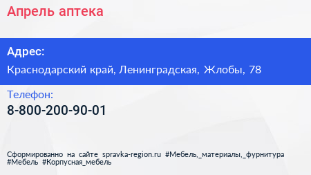 Апрель, аптека по адресу Краснодарский край, Ленинградская, Жлобы, 78 в дальнейшем Организация, размещена в следующих категориях: