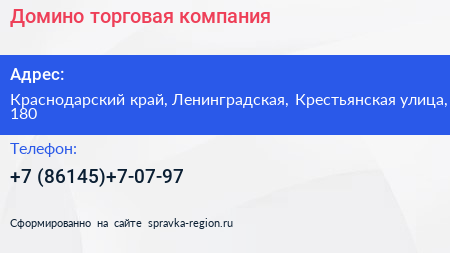 Домино, торговая компания по адресу Краснодарский край, Ленинградская, Крестьянская улица, 180 в дальнейшем Организация, размещена в следующих категориях: