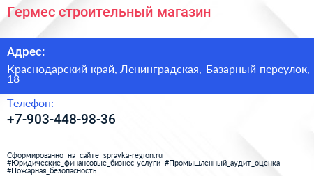 Гермес, строительный магазин по адресу Краснодарский край, Ленинградская, Базарный переулок, 18 в дальнейшем Организация, размещена в следующих категориях: