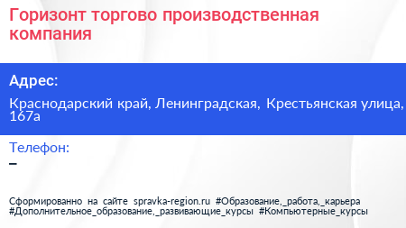 Горизонт, торгово-производственная компания по адресу Краснодарский край, Ленинградская, Крестьянская улица, 167а в дальнейшем Организация, размещена в следующих категориях: